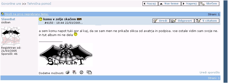 a sem komu napot tuki gor al kaj, da se sam men ne prikaže slikca od avatrja in podpisa. vse ostale vidim sam svoje ne. in tut album mi ne dela