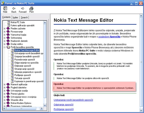 Narobe je to, da Symbian telefoni niso podprti za posiljanje sporocil... PC Suite je za vec telefonov... To informacijo dobis s pritikom na tikpo F1